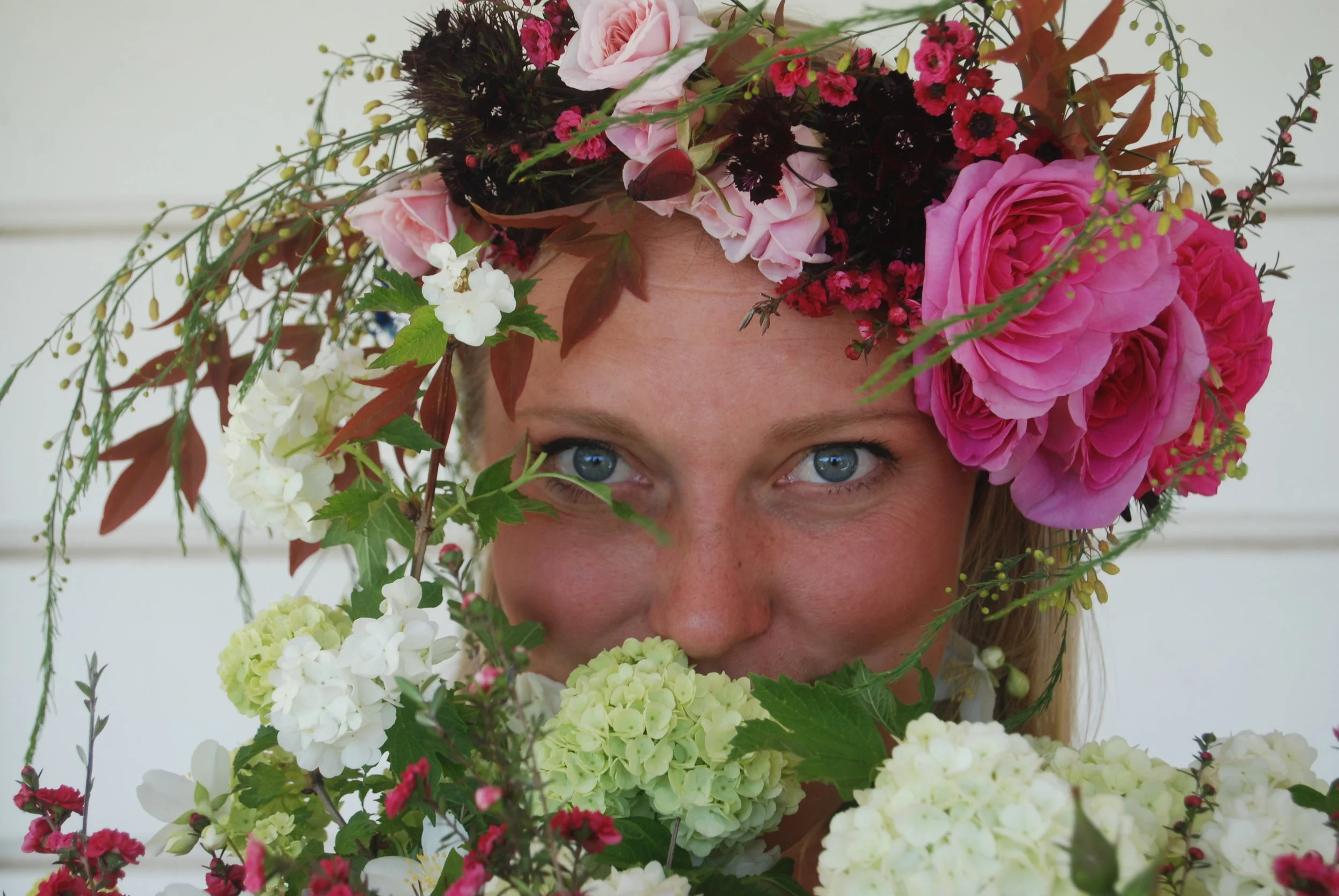 Farming started for me growing up on Wiggle Worm Bait Farm in Graton, Ca. My parents tended rich worm beds with the motto, "We like them fat and lively!" and I got to be a wild worm loving farm kid. One of my farm chores growing up was to create floral arrangements around the house. Little bud vases of daphne and violets sat above the kitchen sink in February, big vases of bearded iris and mock orange graced the bathroom in late Spring and bedside posies of rattle snake grass and yarrow made nights feel special through the summer. I bent willows into crowns, weeded my mom's gardens, and munched on fresh green miners lettuce and asian pears from the neighbor's farm. The puff ball viburnum and cabbage roses featured in floral crown on the left are from the same plants I used to have petal fights with as we waited for the school bus. It wasn't until I was studying agroecology at UC Berkeley, however, that I realized Sonoma County is an agricultural gem and I was blessed to grow up a bit wild and plant loving.